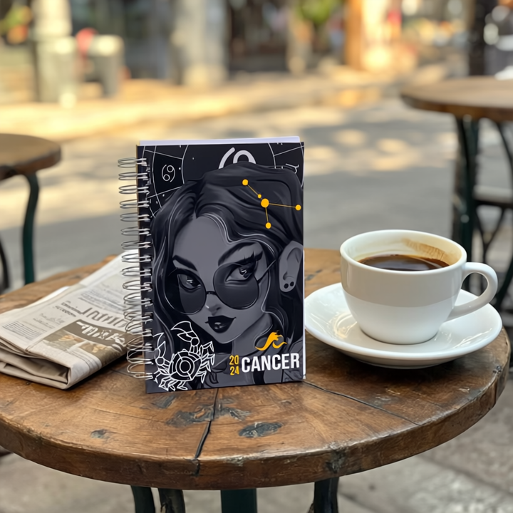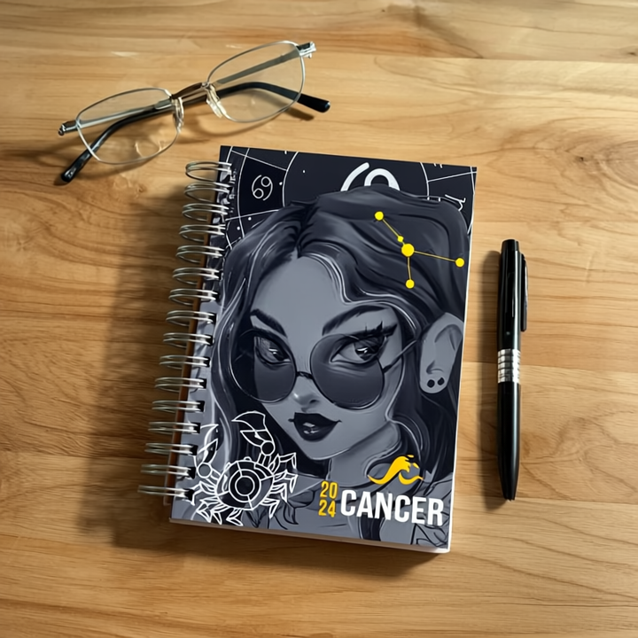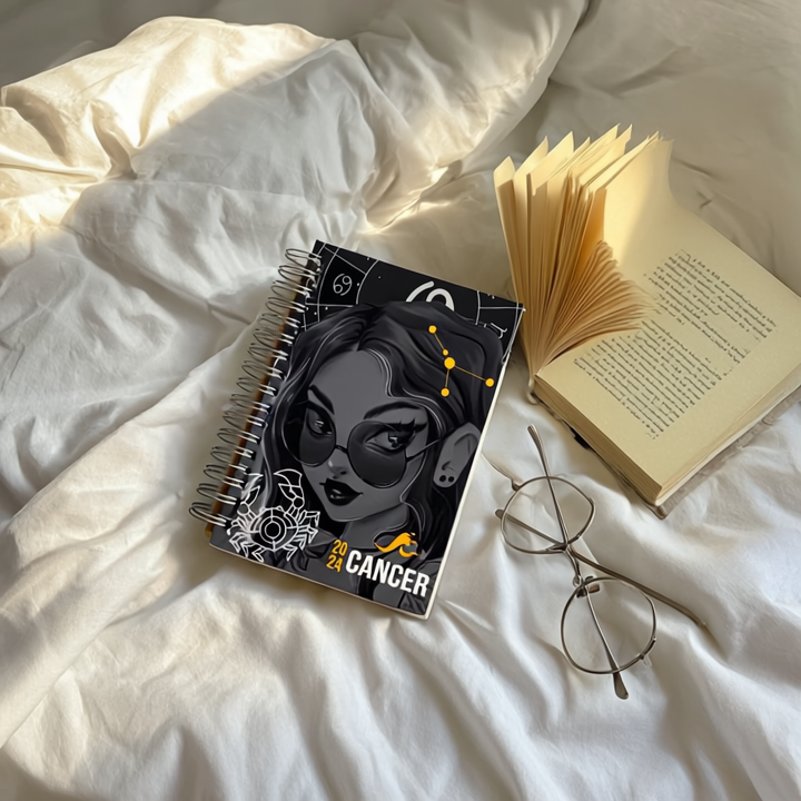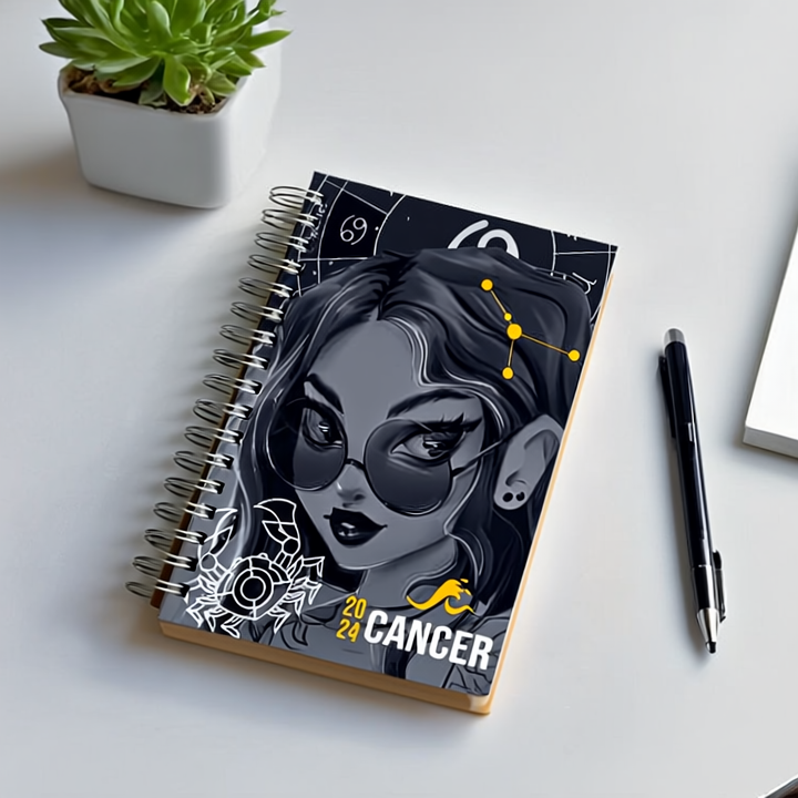 This B5 diary has 250 pages of 120gsm paper with a hard cover and metal spiral. The dark grey cover features a stylized portrait with sunglasses, piercings, and the Cancer symbol with constellation accents in yellow, giving a dramatic, edgy, and astrological look. Perfect for journaling, astrology notes, or daily writing.