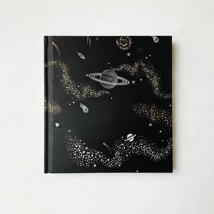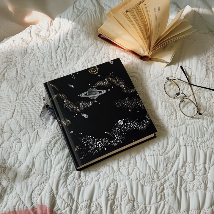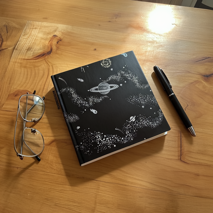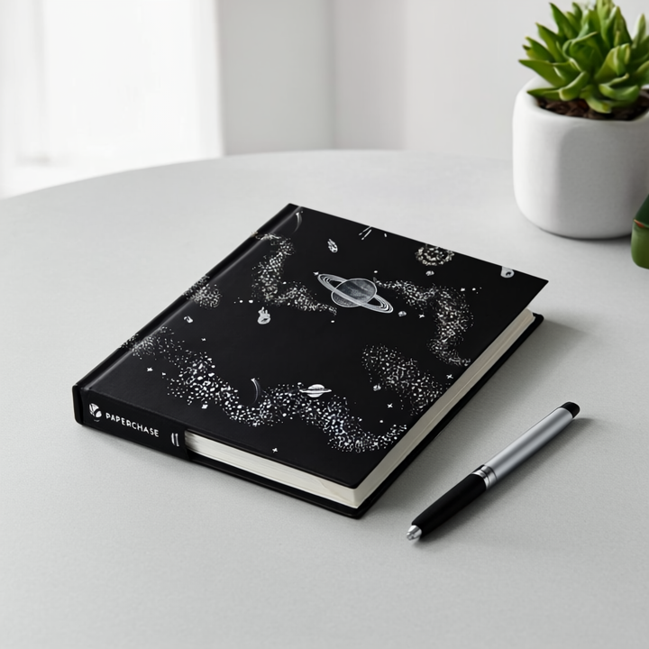 This Galaxy Night Sky Diary features a deep black cover with a stunning space-themed design. Planets, stars, and cosmic swirls in gold and white create a dreamy outer-space scene that feels both modern and magical. Made in B5 size with a hard cover and hardbound, it opens flat for smooth writing. It includes 200 thick 120 GSM pages, perfect for journaling, note-taking, or daily planning. A stylish pick for anyone who loves astronomy, space, or elegant celestial designs.