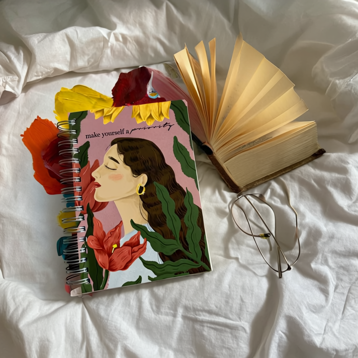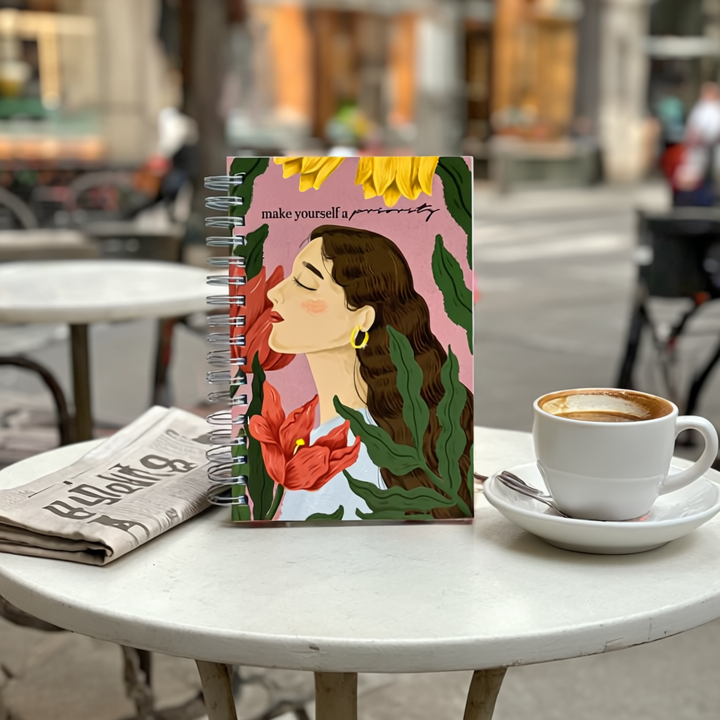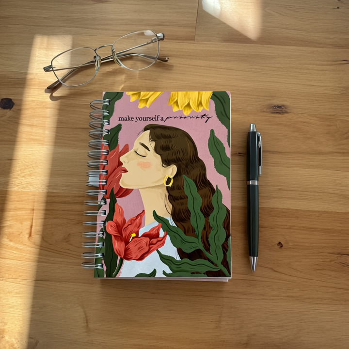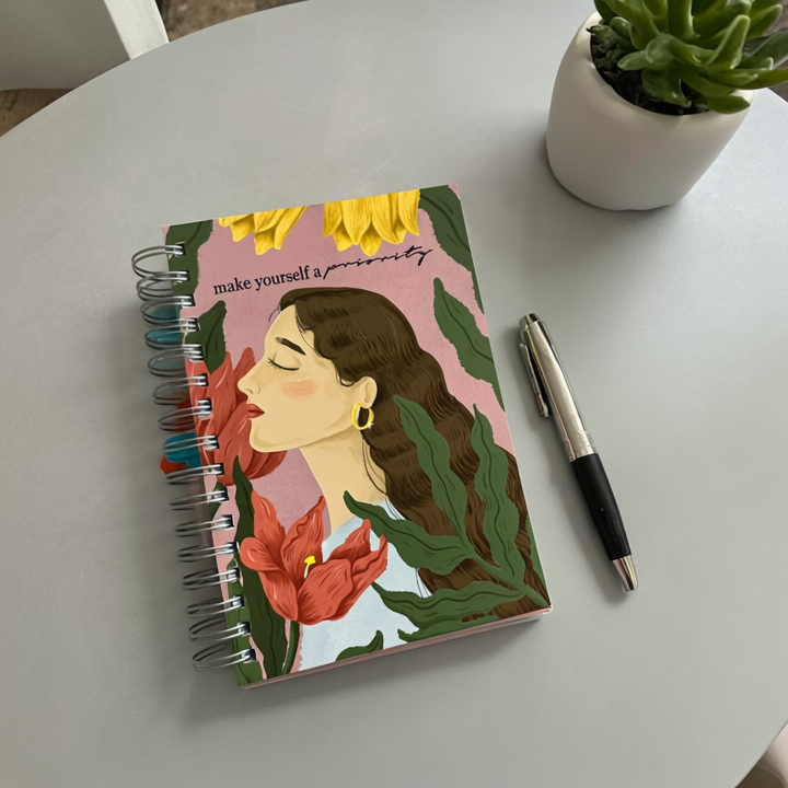 This B5 diary has 250 pages of 120gsm paper with a hard cover and metal spiral. The soft pink cover features a modern illustration of a calm woman surrounded by vibrant flowers with the text "make yourself a priority", giving an inspirational, contemporary, and self-care vibe. Perfect for journaling, planning, or personal reflection.