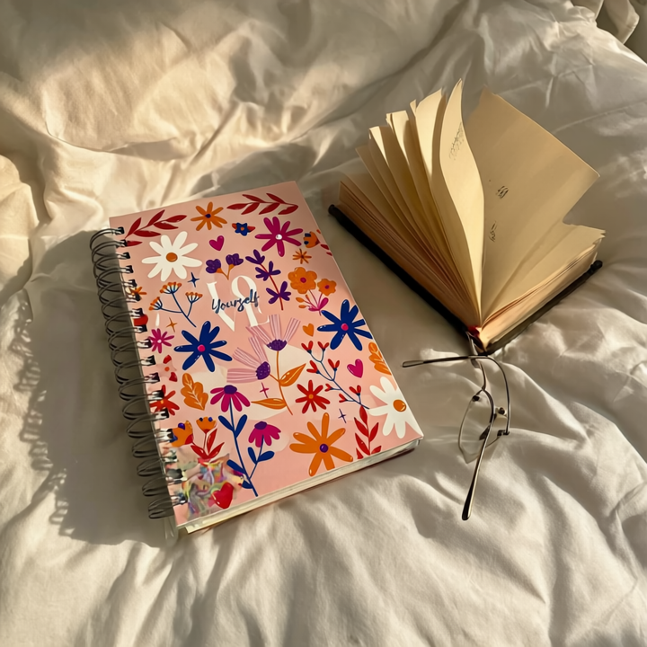 Bright and uplifting, this Love Yourself Floral Spiral Diary features a dense, colorful mix of stylized flowers, leaves, and hearts on a soft pink background, with an inspiring “Love Yourself” message at the center. Crafted in B5 size with a durable hard cover and metal spiral binding, it lies flat for easy writing. Contains 200 premium 120 GSM pages, ideal for journaling, goal setting, or daily reflections. A perfect blend of functionality and feminine, bohemian charm.