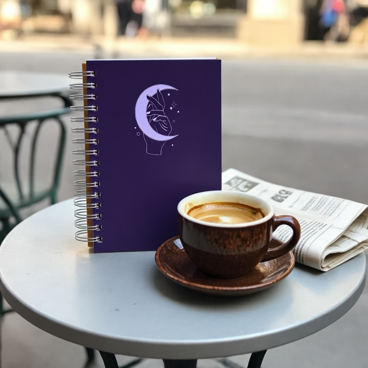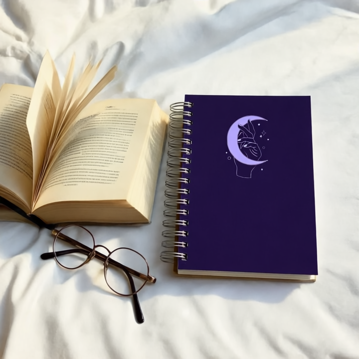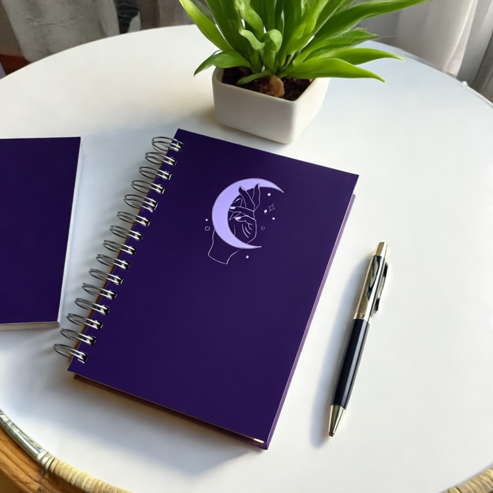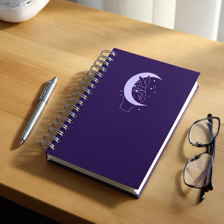This B5 diary has 250 pages of 120gsm paper with a hard cover and metal spiral. The deep purple cover features a stylized hand behind a bright crescent moon with stars, giving a minimalist, celestial, and magical look. Ideal for journaling, writing, or daily notes.