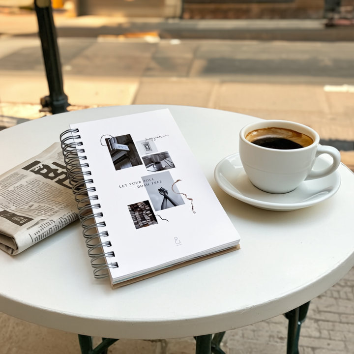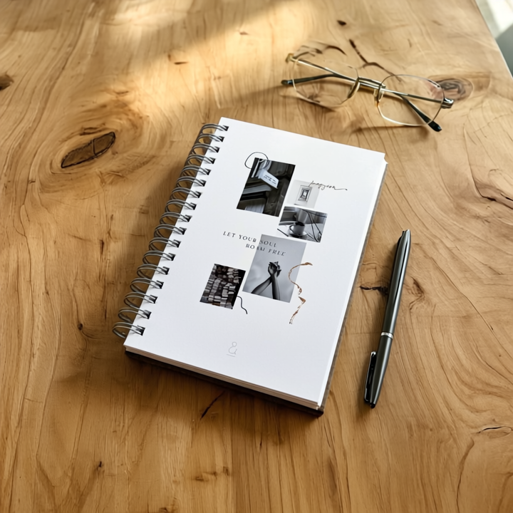 This B5 diary has 250 pages of 120gsm paper with a hard cover and metal spiral. The white cover features a modern collage of black-and-white photos, subtle drawings, and the text "LET YOUR SOUL ROAM FREE", giving a minimalist, contemporary, and inspirational look. Perfect for journaling, reflection, or daily writing.