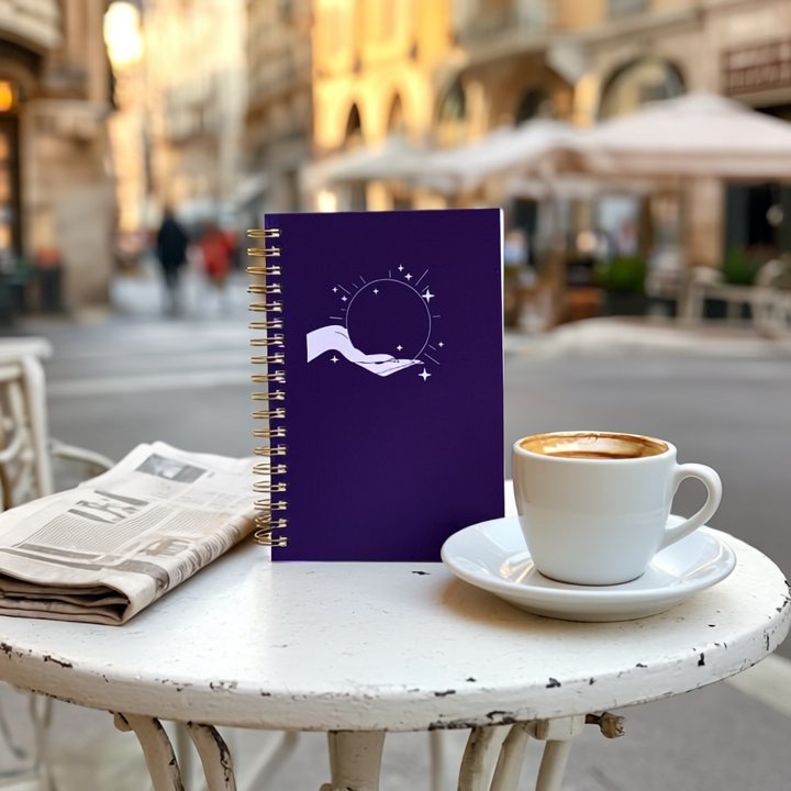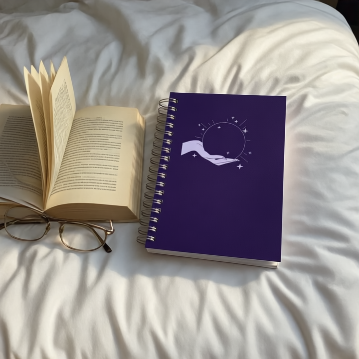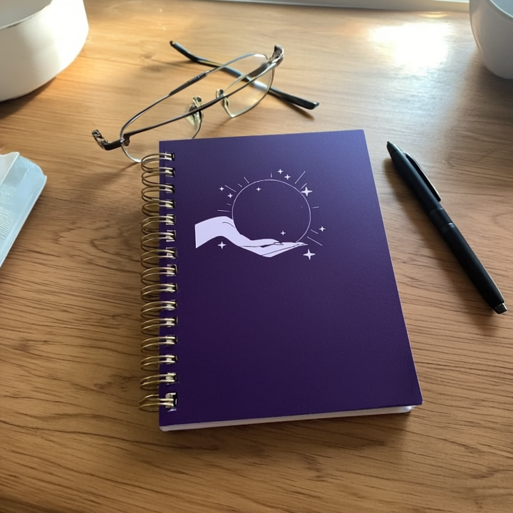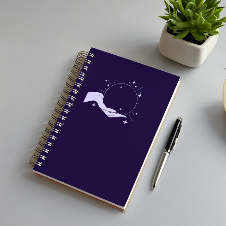 This B5 diary has 250 pages of 120gsm paper with a hard cover and metal spiral. The deep purple cover features a simple white hand holding a glowing circle with stars, giving a clean, mystical, and elegant look. Perfect for journaling, writing, or daily notes.