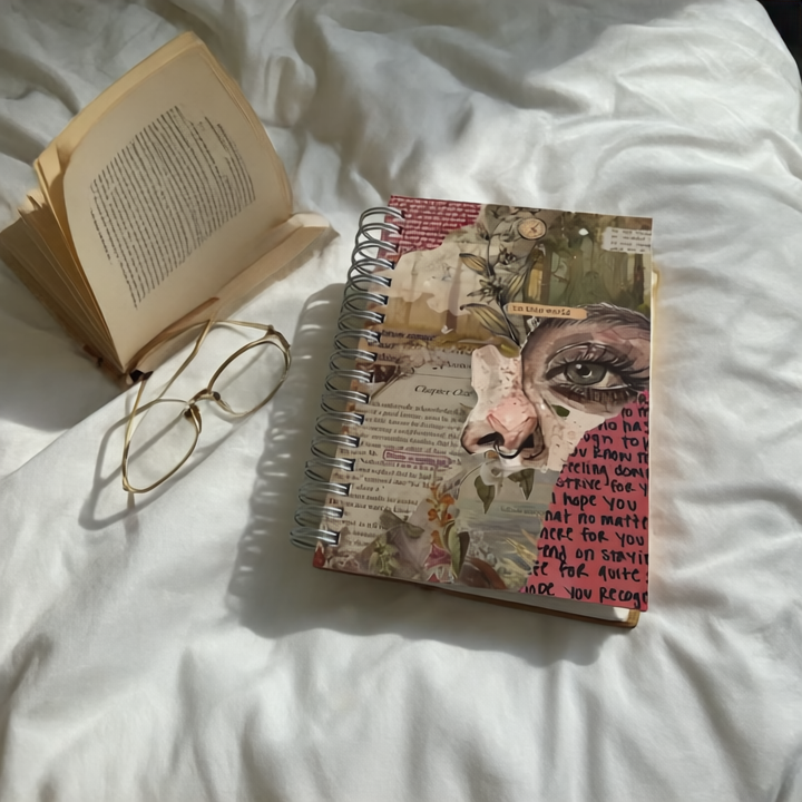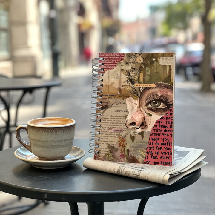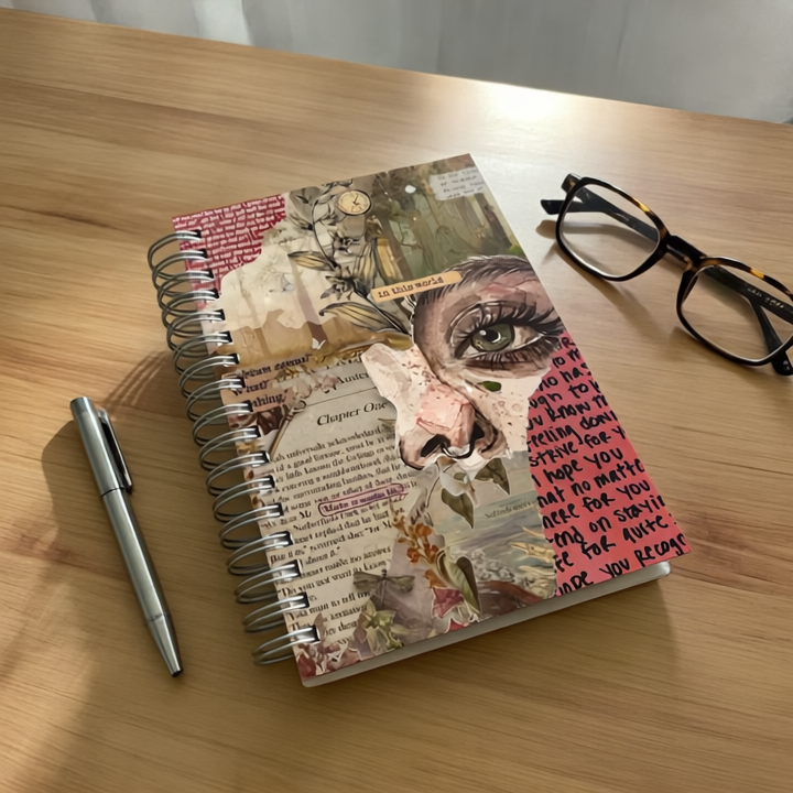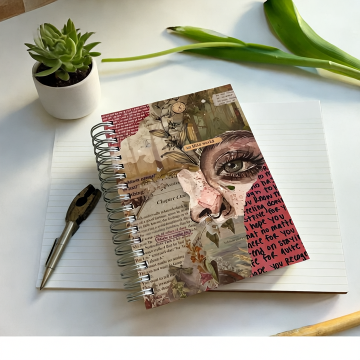 This B5 diary has 250 pages of 120gsm paper with a hard cover and metal spiral. The muted, earthy cover features a layered collage of a detailed face, vintage book clippings, clocks, flowers, and motivational text, giving a moody, artistic, and introspective look. Perfect for journaling, art notes, or personal reflection.