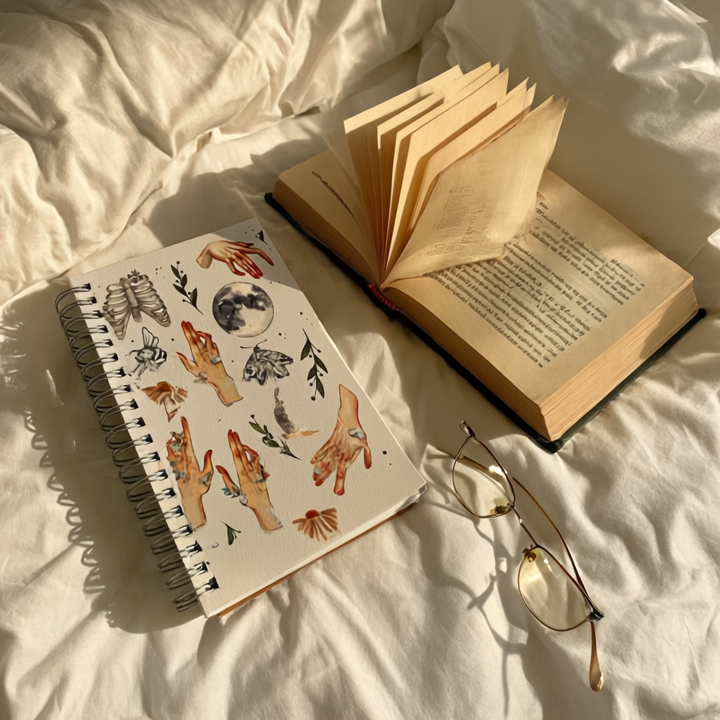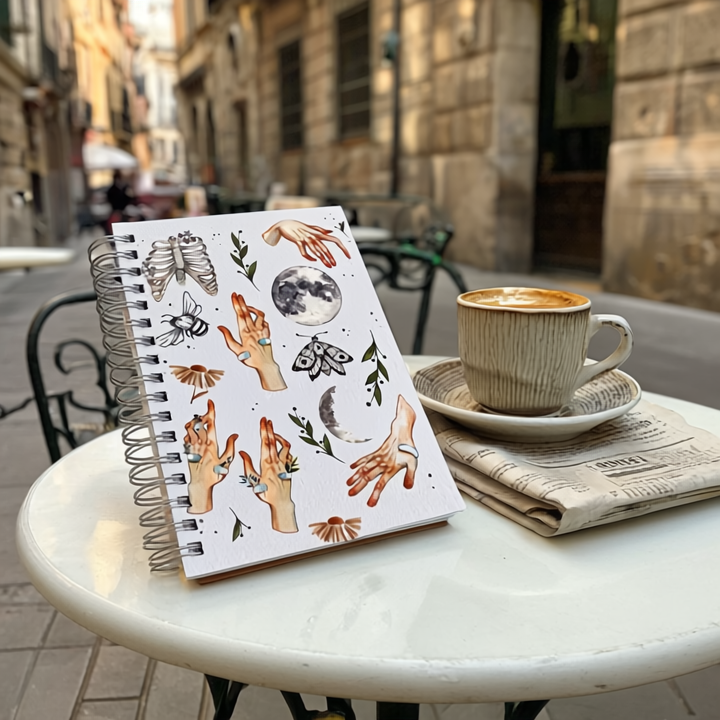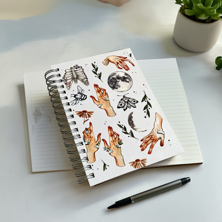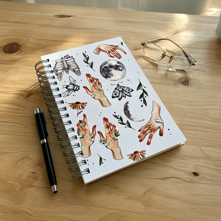 This B5 diary has 250 pages of 120gsm paper with a hard cover and metal spiral. The cover shows magical, nature-inspired drawings of hands, moons, flowers, and leaves on a white background. Ideal for writing, drawing, or journaling every day.