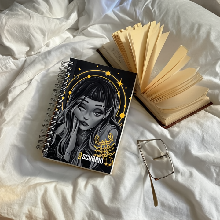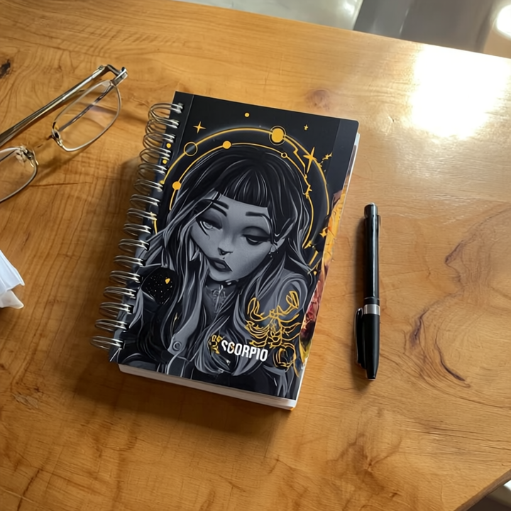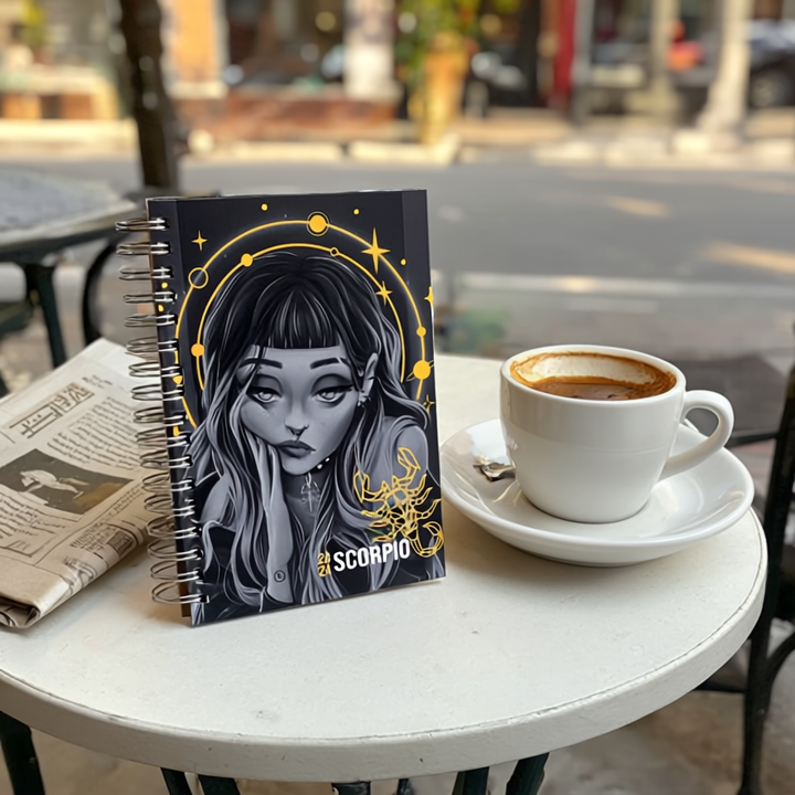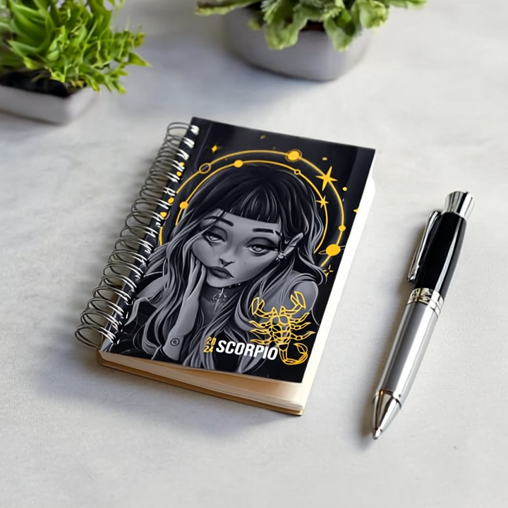 This Scorpio Zodiac Spiral Diary features a bold black and grey cover with bright gold accents for a strong, moody look. The design shows a stylized illustration of a young woman, along with the Scorpio name, scorpion graphic, and constellation, blending zodiac and gothic styles. Made in B5 size with a hard cover and metal spiral, it opens flat for easy writing. It has 200 thick 120 GSM pages, perfect for journaling, notes, or planning. A striking choice for anyone who likes dark, artistic, and astrology-themed designs.