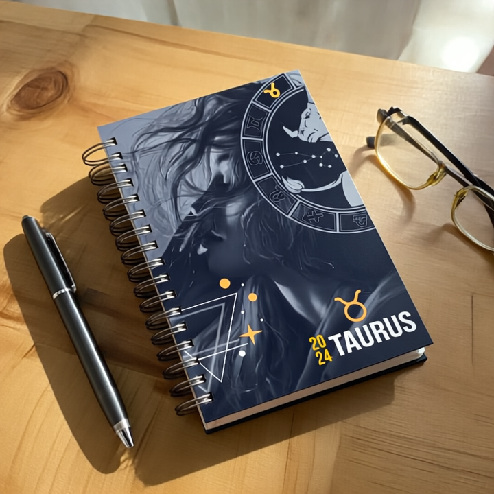 This Taurus Zodiac Spiral Diary features a deep blue and grey cover with bright gold details that highlight the Taurus name, symbol, zodiac wheel, and bull graphic. The design includes a stylized portrait with flowing hair, geometric shapes, and star accents, giving it a bold and modern look. Made in B5 size with a hard cover and metal spiral, it opens flat for smooth writing. It has 200 thick 120 GSM pages, perfect for notes, journaling, or planning. A strong pick for anyone who loves astrology and artistic designs.