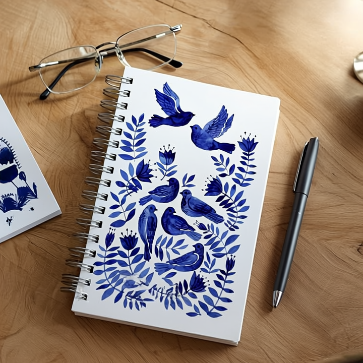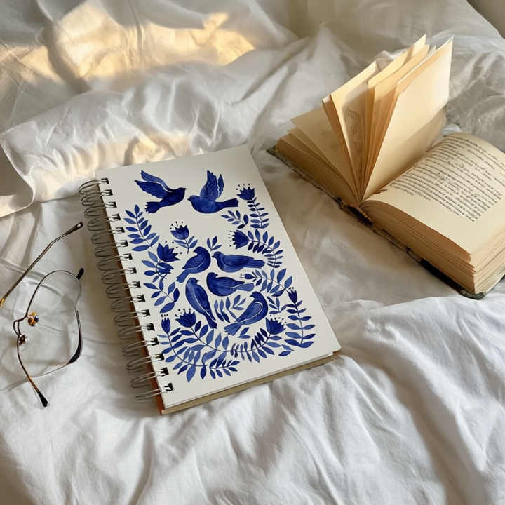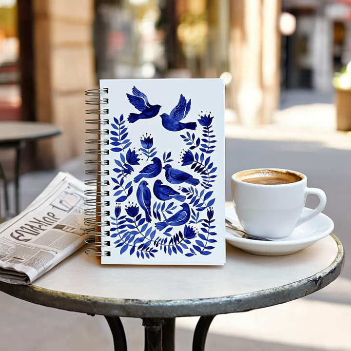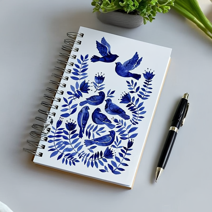 This B5 diary has 250 pages of 120gsm paper with a hard cover and metal spiral. The deep blue and white cover features birds among stylized flowers and foliage in a watercolor style, giving a classic, decorative, and elegant look. Perfect for journaling, sketching, or daily writing.